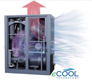 離心風(fēng)機(jī)位于機(jī)體內(nèi)部的一系列吸入孔同時(shí)將機(jī)組內(nèi)部的熱空氣向頂部排出。這一冷卻流場(chǎng)設(shè)計(jì),使空壓機(jī)內(nèi)部始終保持較低溫度,同時(shí)大大降低因風(fēng)扇動(dòng)作而產(chǎn)生的噪音。